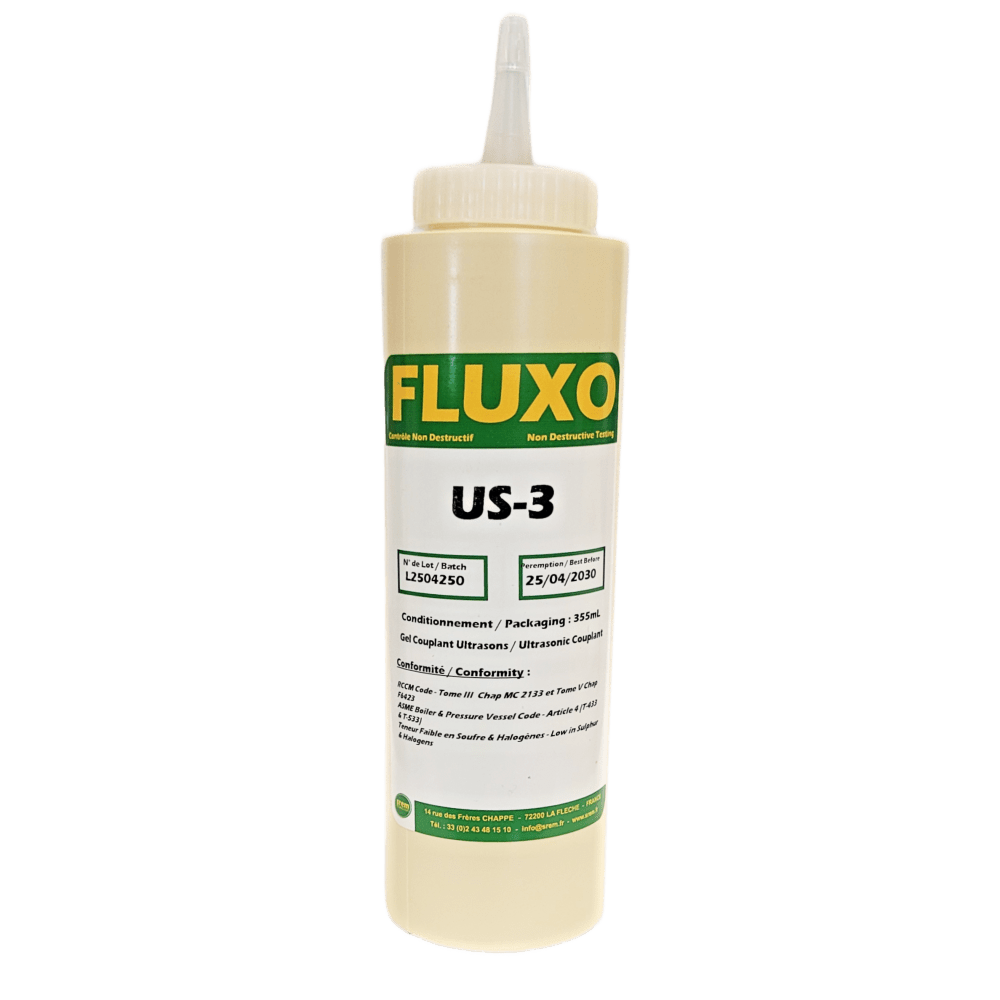 FLUXO US-3 je ultrazvuková vazební látka ve formě gelu, která se skládá z vody, povrchově aktivních látek, inhibitorů koroze a gelotvorných činidel. Tento gel je nedráždivý, netoxický a bezpečný pro životní prostředí. Díky svému složení je kompatibilní s kontrolou kompozitních materiálů a má vynikající antikorozní vlastnosti na všech typech kovů, jako je ocel, litina, hliník a Inconel.