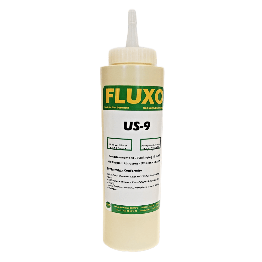 FLUXO US-9 je bezpečný a netoxický ultrazvukový vazební gel s nízkým obsahem síry a halogenů, díky čemuž je vhodný pro použití v jaderném průmyslu. Složení na bázi vody, povrchově aktivních látek, inhibitorů koroze a gelotvorných činidel zajišťuje, že nemá žádný korozivní účinek na kovy a poskytuje vynikající akustický přenos. Je navržen pro snadné použití na velkých plochách a svislém povrchu.